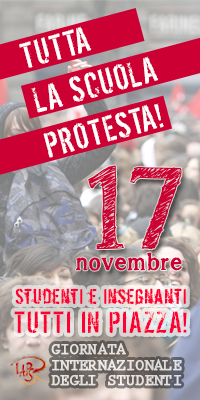 Appello per il 17 novembre La scuola non può restare a guardare la sua stessa distruzione. È evidente che l’obiettivo generale è dequalificare l’istruzione, la formazione e la cultura a merce; è eliminare passo dopo passo welfare, diritti, cultura. Lo sciopero generale europeo del 14 novembre ci ha visto tutti uniti nell’opporci al ricatto che BCE, FMI e Commissione Europea vogliono imporre sulle nostre teste. > Appuntamento per Sesto San Giovanni |