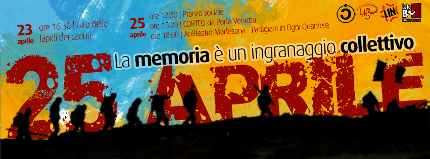 23 Aprile ore 16:30 ritrovo al Lato B per raggiungere alle 18:00 piazzale Cantore da dove partirà il giro delle lapidi dei caduti con deposizione delle corone commemorative – in collaborazione con l’Anpi Porta Genova